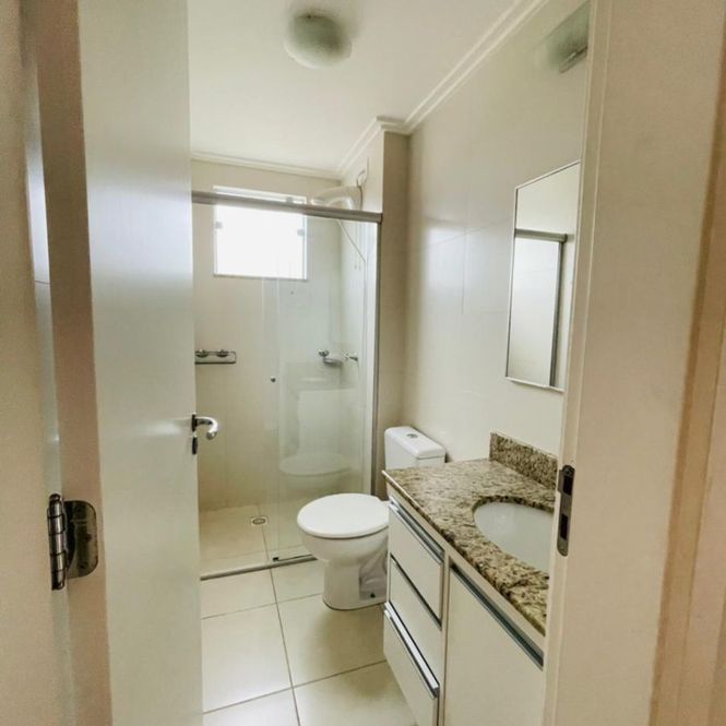 Excelente apartamento dispondo de um sala de estar e uma sala de jantar, cozinha com armários, dois quartos e mais uma suíte com banheiro, área de serviços, churrasqueira e uma vaga de garagem.