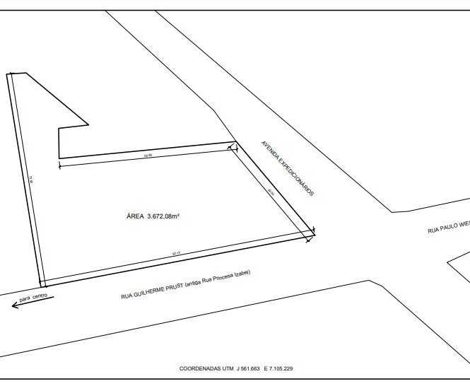 Terreno com área de 3.672,08 m², sendo 92,15 m² de frente, 42,00 m² de lado, 58,80 m² de fundos e 73,50 m² de lado conforme imagem, e barracão de alvenaria medindo 674,41 m²